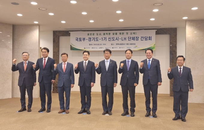 | ▲ 22일 정부서울청사에서 국토부 경기도 1기신도시 LH 단체장 간담회가 열렸다 왼쪽부터 이한준 LH 사장, 하은호 군포시장, 신상진 성남시장, 오병권 경기도 부지사, 박상우 국토부장관, 이동환 고양시장, 최대호 안양시장, 송재환 부천 부시장 |