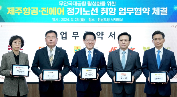 업무협약은 김영록 전남도지사와 김산 무안군수, 김이배 제주항공 대표이사, 박병률 진에어 대표이사, 허준희 한국공항공사 글로컬사업본부장이 참석했다.
