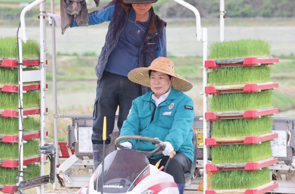 이날 공영민 군수는 첫 모내기 영농현장을 방문해 직접 모판을 나르고, 이양기를 조작하며 모내기를 돕고 풍년 농사를 기원했다.