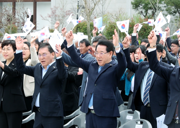 ▲ 김영록 전라남도지사가 11일 무안 남악의 항일독립운동기념탑에서 열린 ‘제105주년 대한민국임시정부수립 기념식’에 참석, 참석자들과 만세삼창을 하고 있다. |