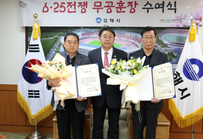 [뉴스서울] 김해시는 20일 시장실에서 6·25전쟁에 참전해 공을 세운 故조우익 병장, 故양만수 중사의 유가족에게 국방부장관을 대신하여 화랑무공훈장을 전달하는 전수식을 가졌다.