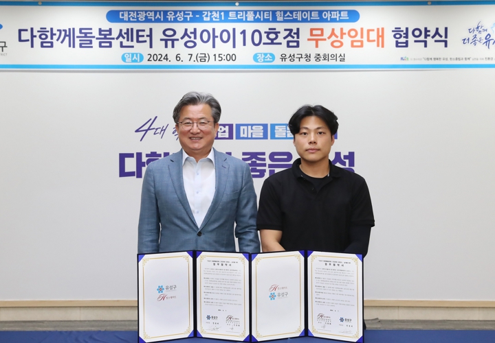 [뉴스서울] 대전 유성구는 지난 7일 유성구청 중회의실에서 갑천1 트리풀시티 힐스테이트아파트 입주자대표회의와 관계자 등이 참석한 가운데 ‘다함께돌봄센터 유성아이 10호점 설치 및 운영’에 관한 무상임대 협약을 체결했다.