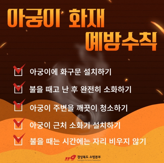 박근오 경북소방본부장은 “최근 경북 도내에 아궁이 사용으로 인한 화재가 늘어나고 있다”며 “도민 여러분께 안전 수칙 준수를 당부드리며 경북소방본부도 화재 발생 예방을 위하여 최선의 노력을 다하겠다”고 전했다.