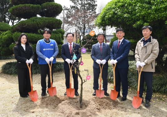 | ▲ 성낙인 군수와 창녕군의회 의장, 공무원 및 공무직 노조위원장이 청렴나무를 심고 있다 |