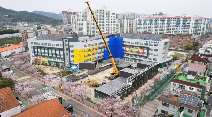 ㈜대승엔지니어링, ㈜엔알비에서 통영시에 무상 기부한 모듈러 교실은 교실 26실을 포함 전체 30여 동이며 설치가 완료되면 5월초부터 2,3,4학년이 순차적으로 입실할 예정이다.