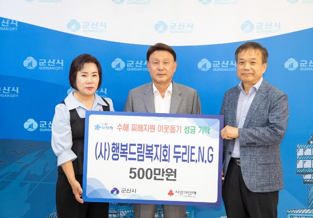 [뉴스서울] 6일 (사)행복드림복지회 두리E.N.G가 집중호우 피해를 입은 저소득 가구와 사회복지시설의 신속한 복구 지원을 위해 성금 500만원을 군산시에 기탁했다.