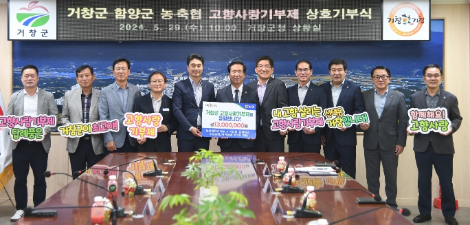 [뉴스서울] 거창군은 지난 29일 거창 4개 농·축협(농협 거창군지부, 수승대농협, 거창사과원예농협, 거창축협)과 함양 5개 농협(농협 함양군지부, 지곡농협, 함양농협, 수동농협, 안의농협) 임직원 260여 명이 고향사랑기부제의 활성화와 두 지역의 상생발전을 응원하며 각 1300만 원을 상호 기부했다고 전했다.