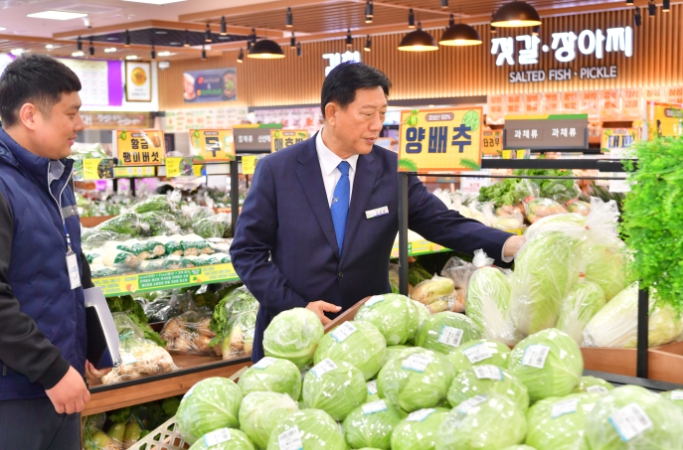 ▲ 장성로컬푸드 첨단직매장이 개장 2년 만에 누적 매출 200억 원을 달성했다. 김한종 장성군수가 직매장 농산물을 살펴보고 있다. |