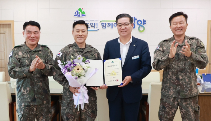 [뉴스서울] 함양군은 29일 오전 군수실에서 서부경남 지역의 완벽한 통합방위태세 확립과 향토방위수호에 혁혁한 공로를 세운 39보병사단 118여단장에게 명예군민증을 수여했다.