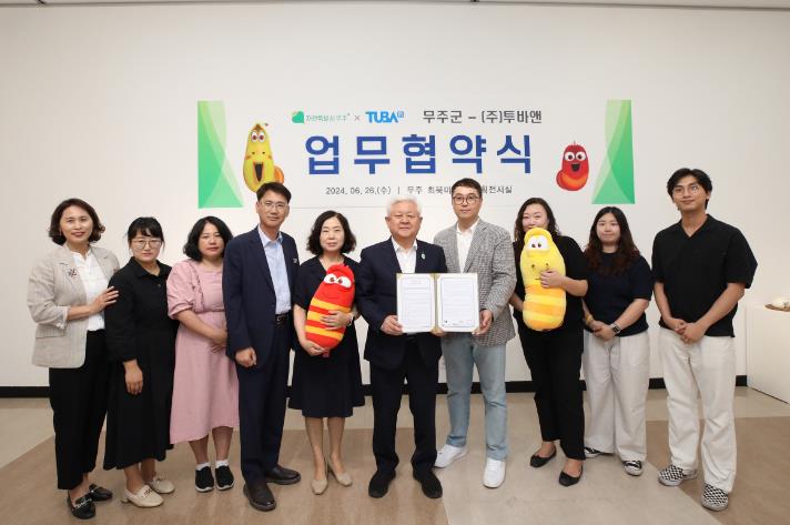 26일 최북미술관 기획전시실에서 열린 업무협약식에는 황인홍 무주군수와 ㈜투바앤 임기택 사업 이사 등 양측 관계자 10여 명이 참석했으며 양측은 전시 교육프로그램 등 주요 사업 진행을 위한 상호협력과 콘텐츠 협업을약속했다.