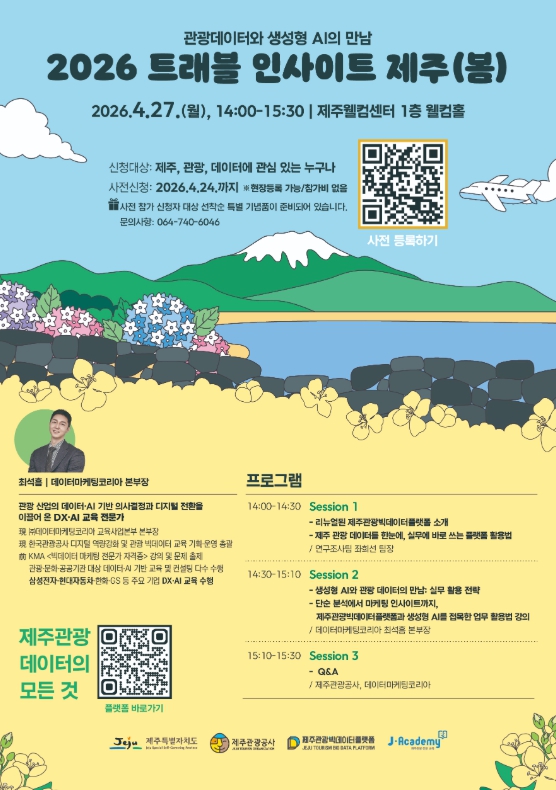 한편, 사전 참가 신청은 4월 24일까지 제주관광 빅데이터 플랫폼 홈페이지(data.ijto.or.kr)를 통해 가능하며, 사전 등록자에 한해 선착순으로 현장에서 기념품이 제공된다. 참가비는 무료이며, 세미나 당일 현장 등록도 가능하다.