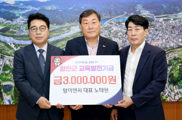 [뉴스서울] 탑이엔씨 대표 노태현은 10일 (사)합천군교육발전위원회를 방문하여 지역인재육성을 위해 써달라며 교육발전기금 300만원을 기탁했다.