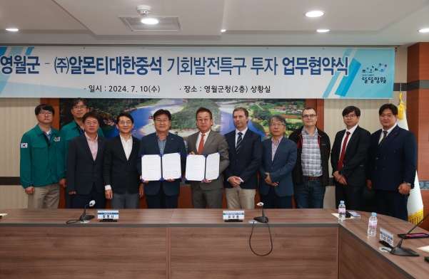 [뉴스서울] 영월군과 ㈜알몬티 대한중석이 지난 7월 10일 오전 10시 영월군청 2층 상황실에서 최명서 영월군수, 유우종 ㈜알몬티 대한중석 부사장 등이 참석한 가운데 영월군 기회발전특구 첨단산업 핵심소재 산업단지의 성공적인 추진 및 지역과 투자기업의 상생발전을 위한 업무 협약을 체결했다.