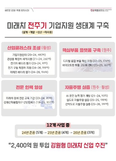강원형 미래차 산업은 4대 전략 총 12개 세부사업으로 24년 5개 사업 준공을 시작으로 26년까지 준공이 완료되면 설계 → 개발 → 생산 → 재사용까지 미래 차 전주기 기업지원 생태계가 구축된다.