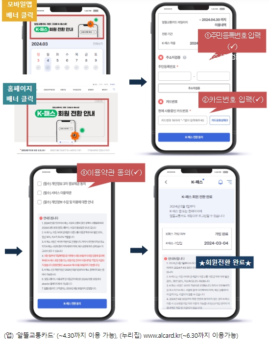 ▲ K-패스 회원전환 방법(알뜰교통카드 앱·누리집에서 안내 중) |