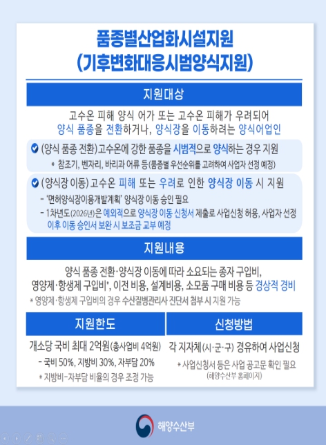 최근 고수온, 적조 등으로 양식장 피해가 증가함에 따라, 해양수산부는 올해부터 ‘기후변화 대응 시범양식 지원사업’을 추진한다. 양식 품종의 전환이나 최적의 양식 장소로 이전을 지원하여 어업인의 피해를 최소화하고 지속가능한 양식 기반을 강화할 계획이다.