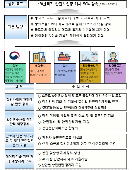 이에 해양수산부는 2030년까지 항만사업장 재해 건수 50% 감축(330건→165건)을 목표로 「항만사업장 안전사고 예방 강화대책」을 마련하고, 그에 따른 4대 전략과 11개 과제를 집중 추진한다.