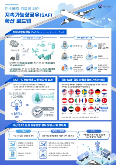 박상우 국토교통부 장관은 이날 정책 발표 현장에서 “기후위기 대응과 항공산업의 지속가능한 성장을 위해 국제항공 탄소감축의 핵심수단인 지속가능항공유(SAF) 사용은 더 이상 선택이 아닌 필수”임을 강조하면서, “금번 정책발표와 국산 SAF 급유 첫 상용운항을 시작으로 국제항공 탈탄소 정책을 적극 추진하여 우리나라가 항공분야 탄소중립 선도국가로서의 위상을 확립해 나가도록 노력할 것”이라고 밝혔다.