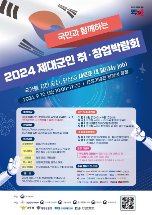 국가보훈부는 10일 오전 10시부터 오후 5시까지 서울 용산 전쟁기념관 평화의 광장에서 ‘2024년 국민과 함께하는 제대군인 취·창업 박람회’를 개최한다고 밝혔다.