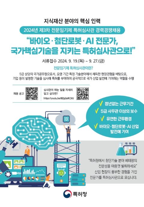 특허청은 올해 상반기부터 바이오·첨단로봇·인공지능분야 심사관 증원을 위한 관계부처 협의에 착수해, 8월에 인력증원 및 예산협의까지 마무리함에 따라 금번 채용을 진행하게 됐다.