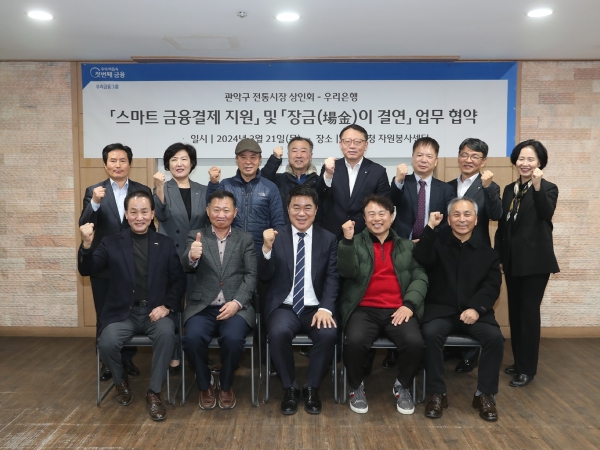 지난 21일 관악구에서 전통시장 상인회와 우리은행이 상생경영과 동반성장을 위한 '관악구 전통시장 스마트 금융결제 지원' 업무 협약을 체결하고, 스마트 결제 인프라 구축을 시작한다.