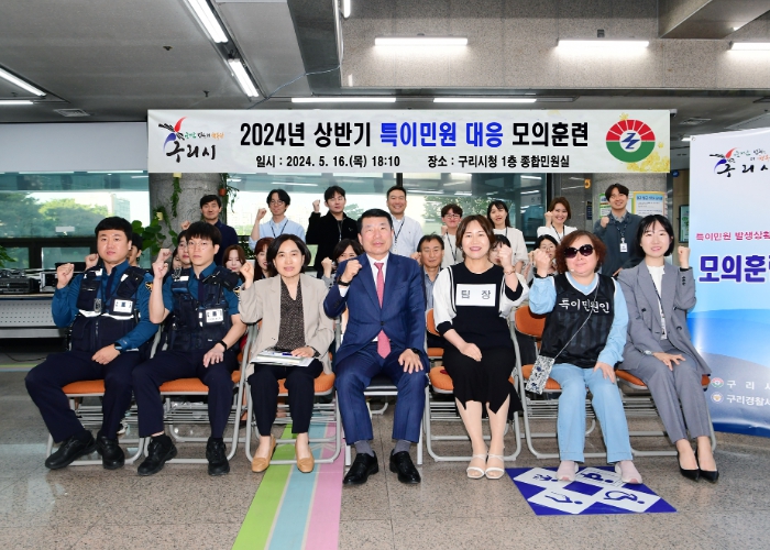 [뉴스서울] 구리시는 폭언·폭행 등 악성민원 및 위법행위로부터 어려움을 겪는 공무원을 보호하기 위해 5월 16일 시청 1층 종합민원실에서 민원실 직원, 청원경찰, 구리경찰서 교문지구대 경찰 등 50여 명이 참여한 가운데 ‘특이민원 발생 대비 모의훈련’을 실시했다.
