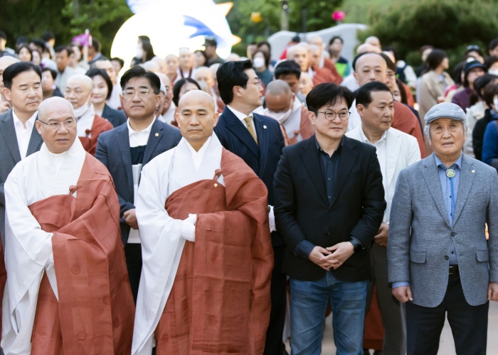 | ▲ 김포시불교연합회가 지난 21일 김포아트빌리지 한옥마을에서 다문화가족 및 김포시민과 함께 하는 연등회를 개최했다. 이날 행사에는 김병수 시장과 김인수 의장 등이 함께 하고 있다. |