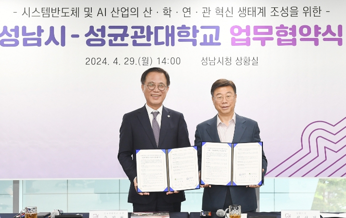 성남시는 29일 오후 2시 성남시청 상황실에서 신상진 성남시장과 유지범 성균관대학교 총장이 참석한 가운데 해당 내용을 담은 시스템반도체 및 AI 산업의 산‧학‧연‧관 혁신 생태계 조성을 위한 업무협약을 체결했다.