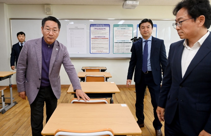 ▲ 유정복 인천광역시장이 13일 중구 인천영종고등학교에서 2025학년도 대학수학능력시험 시험장을 점검하고 있다. |