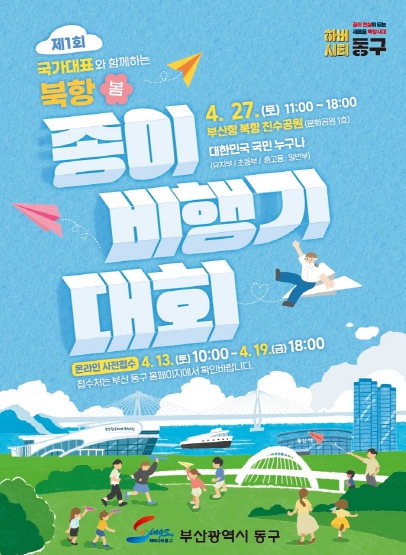[뉴스서울] 부산 동구는 오는 4월 27일 북항친수공원(문화공원1호)에서 색다른 봄축제 ‘북항 종이비행기 페스티벌'을 개최한다고 밝혔다. 행사는 오전 11시부터 오후 6시까지 열리며, 종이비행기 날리기 대회, 공연, 체험활동 등 다채로운 프로그램으로 구성된다.