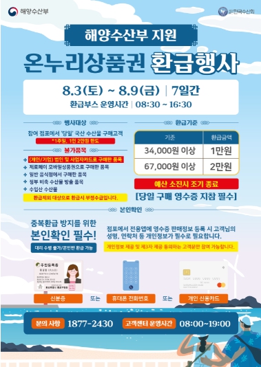 수산물 관련 민생을 확인하고 물가 안정을 도모하기 위해 해양수산부에서 마련한 이번 행사는 전통시장 내 환급행사 참여 점포에서 국내산 수산물을 구입 후 카드영수증 또는 현금영수증을 가지고 시장 내 마련된 상품권 교환처에서 본인 확인 후 수령 받을 수 있다.
