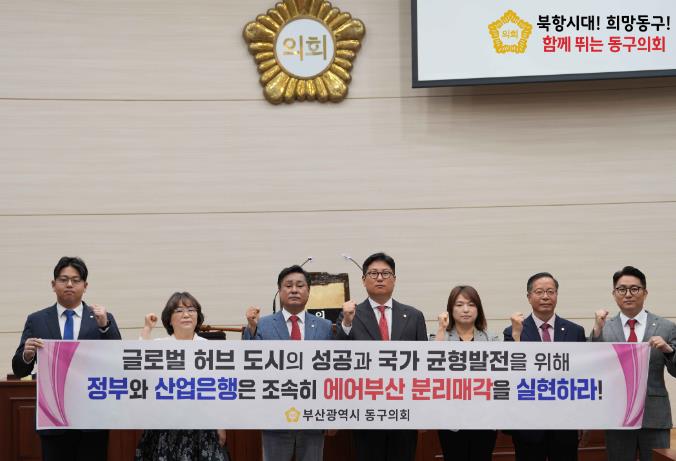 [뉴스서울] 부산 동구의회는 지난 19일, 제323회 정례회 2차 본회의에서 ‘부산 거점항공사 마련을 위한 분리매각 촉구 결의안’을 만장일치로 채택하였다고 밝혔다.