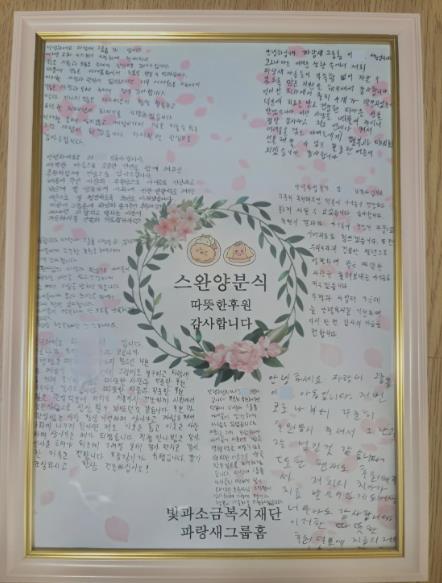 이에 아동들은 스완양분식의 따뜻한 후원에 감사하는 마음을 모아 편지를 작성하였고, 후원인증패와 함께 14일 전달식에서 스완양분식 정민화 대표에게 전달될 예정이다.