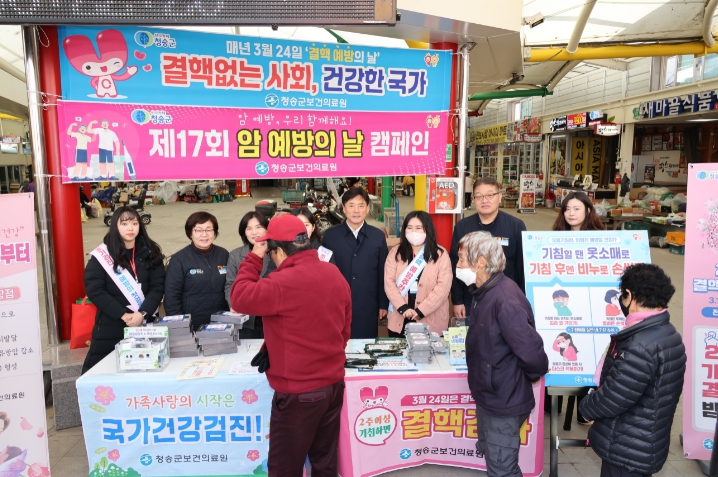 [뉴스서울] 청송군은 지난 18일 ‘암 예방의 날’(3월 21일)과 ‘결핵예방의 날’(3월 24일)을 맞이하여 진보면 전통시장에서 지역주민을 대상으로 캠페인을 진행했다고 밝혔다.