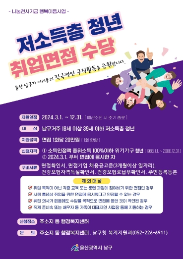 ▲ 울산 남구, 지역 최초 위기가정 청년 면접수당 20만원 지원 |