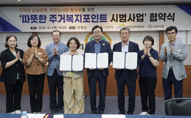 [뉴스서울] 전라남도 나주시는 최근 LH광주·전남지역본부, 나주신협과 작은도서관 및 공동체 활성화를 위한 ‘따뜻한 주거복지포인트 시범사업’ 추진 업무협약을 체결했다고 6일 밝혔다.
