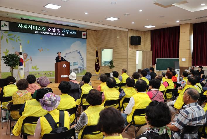 이날 2024년 사회서비스형 노인일자리 참여자 100여 명이 참석한 가운데 경한호 지회장의 개회사, 송인헌 군수의 축사에 이어 참여자 소양교육, 직무교육을 실시했다.