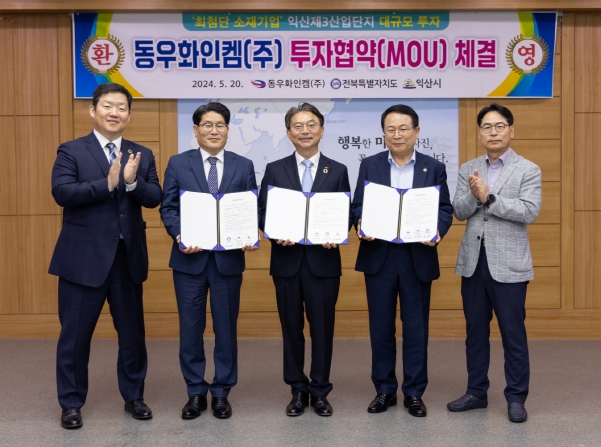 전북특별자치도와 익산시는 20일 익산시청 상황실에서 정헌율 익산시장과 천세창 전북특별자치도 기업유치지원실장, 이종찬 동우화인켐㈜ 대표이사 등이 참석한 가운데 익산제3일반산단 내 대규모 투자를 위한 투자협약(MOU)을 체결했다고 밝혔다.