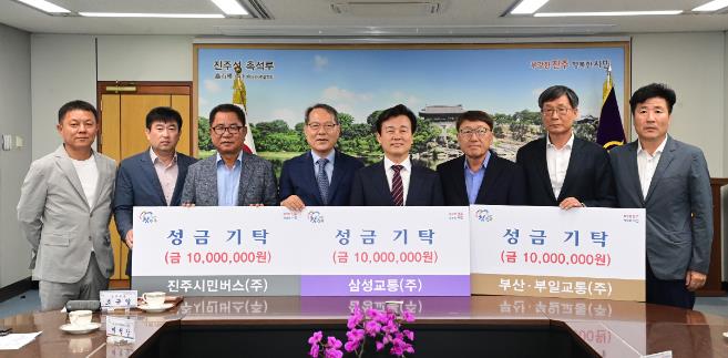 20일 부산교통·부일교통·삼성교통·진주시민버스 등 4개 시내버스 업체 대표들이 진주시를 방문, 취약계층 지원 및 지역 발전을 위해 써달라며 조규일 진주시장에게 3000만 원 성금기탁증서를 전달했다.