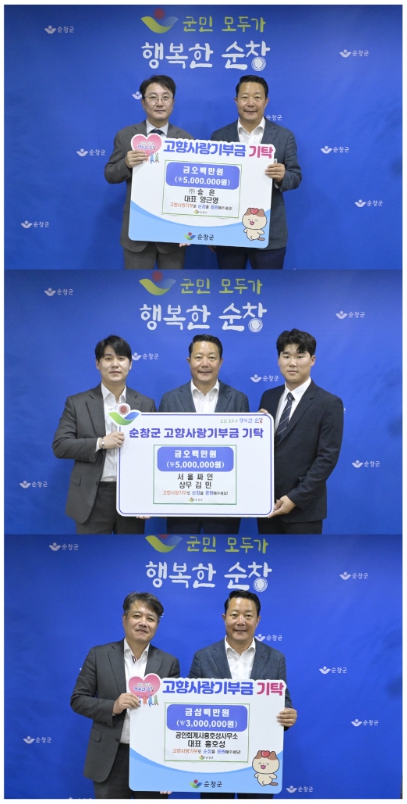 [뉴스서울] 순창군은 17일 ㈜승은 양근영 대표와 서울싸인의 김민 상무가 고향사랑기부금 개인 최고액인 각 500만원, 홍호성 회계사가 300만원을 기탁했다고 밝혔다.