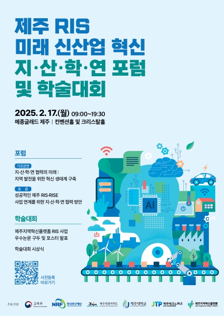 제주특별자치도와 제주지역혁신플랫폼은 오는 17일 메종글래드 제주(컨벤션홀)에서 '제주의 지속 가능한 미래를 위한 혁신과 협력'을 주제로 ‘제주 RIS 미래 신산업 혁신 지·산·학·연 포럼 및 학술대회’를 개최한다.