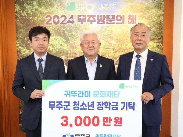 [뉴스서울] 무주군은 지난 28일 귀뚜라미그룹(귀뚜라미문화재단)에서 장학금 3천만 원을 기탁해왔다고 밝혔다. 무주군청 군수실에서 진행된 전달식에는 황인홍 무주군수와 김재춘 무주지점장 등이 함께해 의미를 더했다.