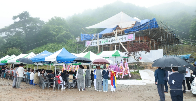 ▲ 함양 등구사 ‘미륵원’명 청동북 보호각 건립 공사 상량식 열려 |