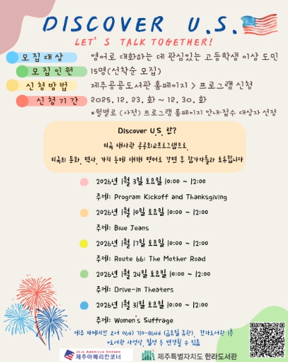 [뉴스서울] 제주특별자치도 한라도서관은 주한미국대사관과 협력해 도민의 글로벌 이해와 영어 활용 역량 강화를 위한 교육 프로그램 ‘Discover U.S.’를 올해부터 운영한다고 밝혔다.