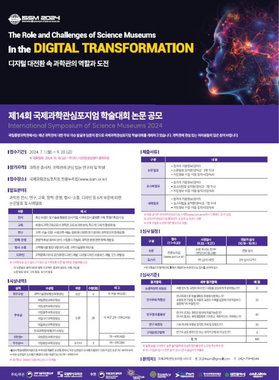 논문 발표 분야는 과학관 관련 6개 부문(전시, 연구, 교육, 정책・운영, 행사・소통, 디자인)이고 논문발표나 사례발표를 선택할 수 있다. 7월 1일부터 9월 20일까지 전용 누리집을 통해 접수할 수 있다.