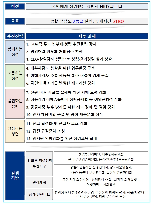 공단은 기획단 운영을 통해 ‘국민에게 신뢰받는 청렴한 HRD 파트너’를 비전으로 4개 분야 13개 세부 과제를 추진한다. 또한 고위직의 적극적 참여를 기반으로 다양한 채널을 통한 전 세대·직급 간 소통을 실시하고, 반복되는 민원사항에 대한 의견수렴 및 제도개선으로 국민 고충을 해결한다. 이를 통해 내·외부 체감도 향상을 위한 자체 노력을 강화할 예정이다.