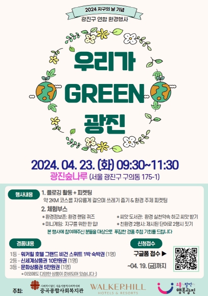 먼저, 23일 오전 광진숲나루에서 환경 캠페인을 실시한다. 중곡종합사회복지관 주관으로 워커힐호텔과 광진구청이 함께 진행하며 기관 관계자, 구민 등 약 100여명의 참가자를 대상으로 플로깅을 비롯해 환경퀴즈존, 씨앗 나무 만들기, 분리배출 방법 안내 및 녹색 실천 캠페인 등 다양한 환경 보호 활동을 추진할 계획이다.