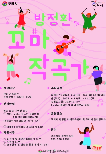 [뉴스서울] 구리시는 방정환 미래교육센터 운영하는 ‘방정환 꼬마작곡가’ 프로그램에 참여할 어린이를 5월 3일부터 6월 3일까지 모집한다.