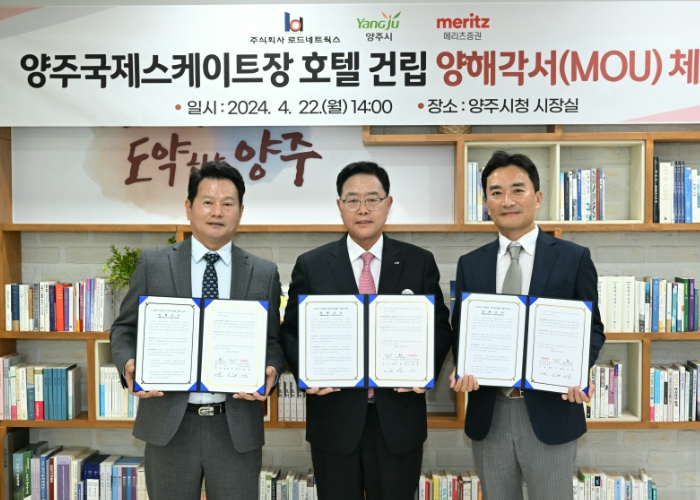 22일 시에 따르면 양주시는 시청에서 ㈜로드네트웍스, 메리츠증권(주)과 ‘국제스케이트장 숙박시설(호텔) 건립을 위한 양해각서(MOU)’를 체결했다고 밝혔다.