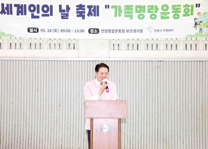 | ▲ 최대호 안양시장이 지난 18일 다문화 및 비다문화가족을 대상으로 열린 가족명랑운동회에서 인사말을 하고 있다 |